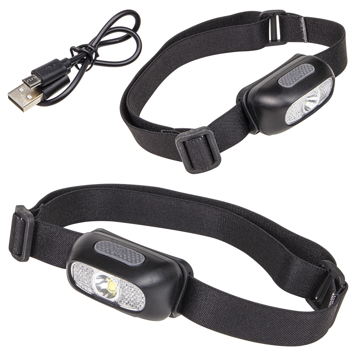 Rechargeable headlamp with adjustable elastic headband Headlamp is adjustable up to 30-degree angle LED has a 200 Lumens bulb 5 light modes: high, medium, low, red, flashing Perfect for jogging, fishing, camping and more! Powered by one built-in 400mAh rechargeable battery Run time: 3 hours for high beam mode / 5 hours for medium beam mode / 7 hours for low beam mode Charging time: 1.5 hours Includes Micro USB cable